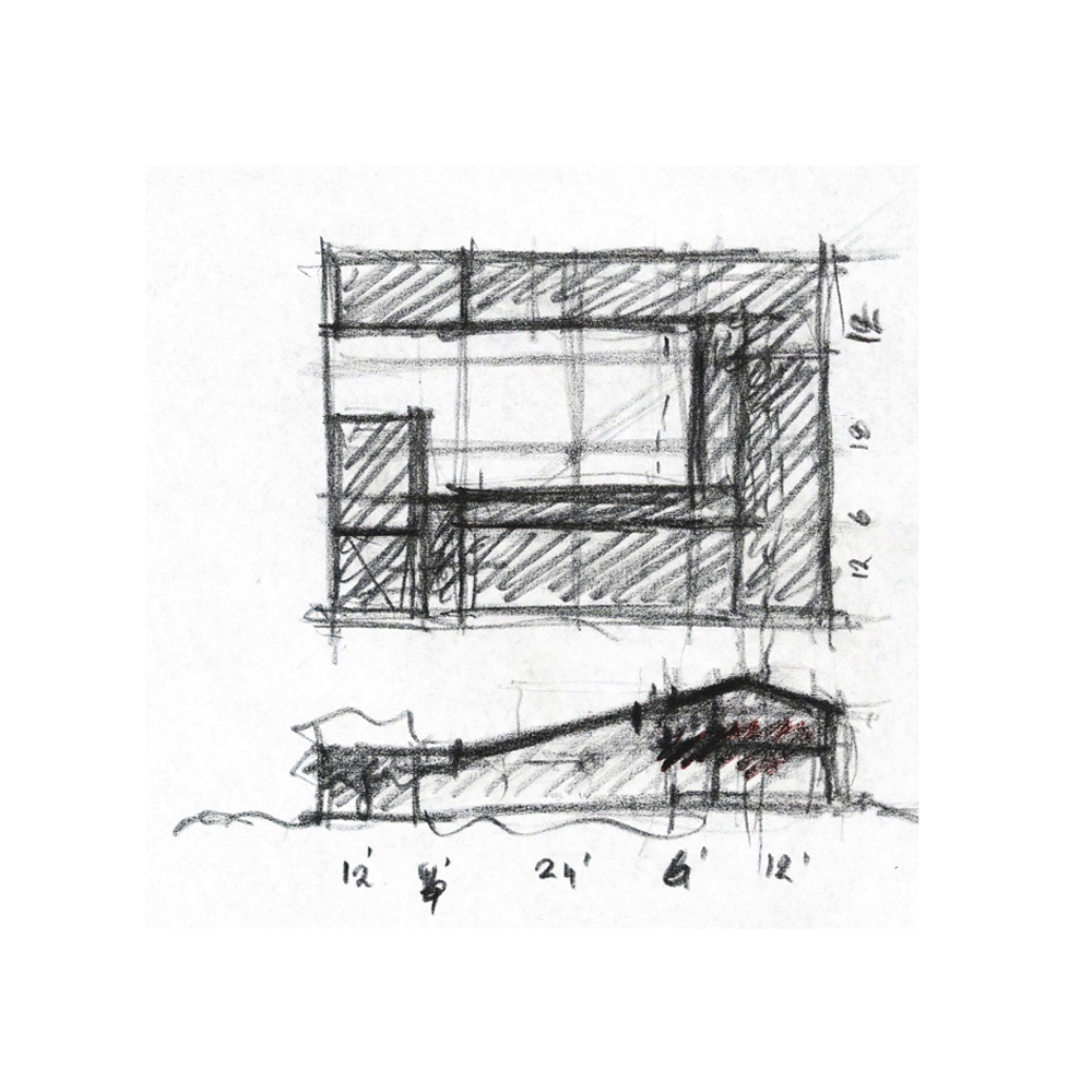 A concrete pitched roof wrapped around a central court creates gradual atmospheric transition from inside to out, fully open to movement of air and varyingly open to views of the court.