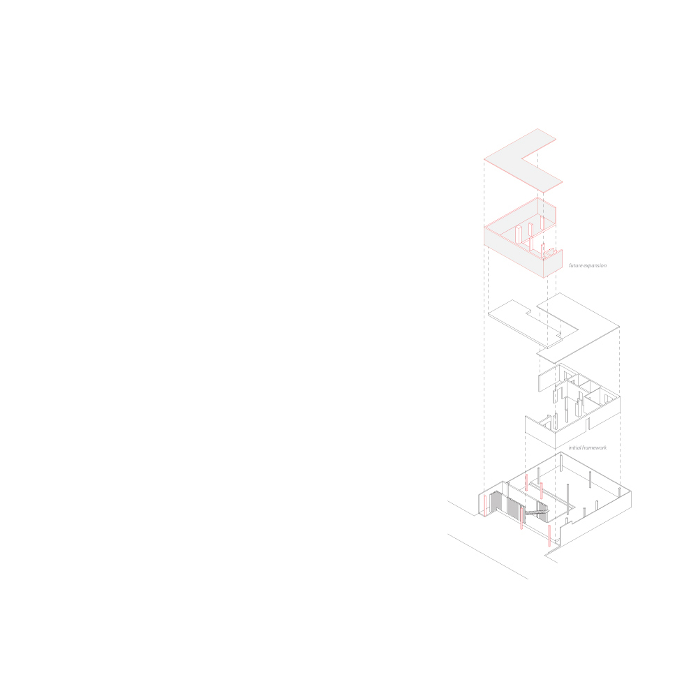 With changes in land-use pattern, the ground floor unit can be converted into an office space. Rather than use complex construction technology, it uses simple RCC frame as the primary structural system with lightweight steel being suggested as an option for future increments.