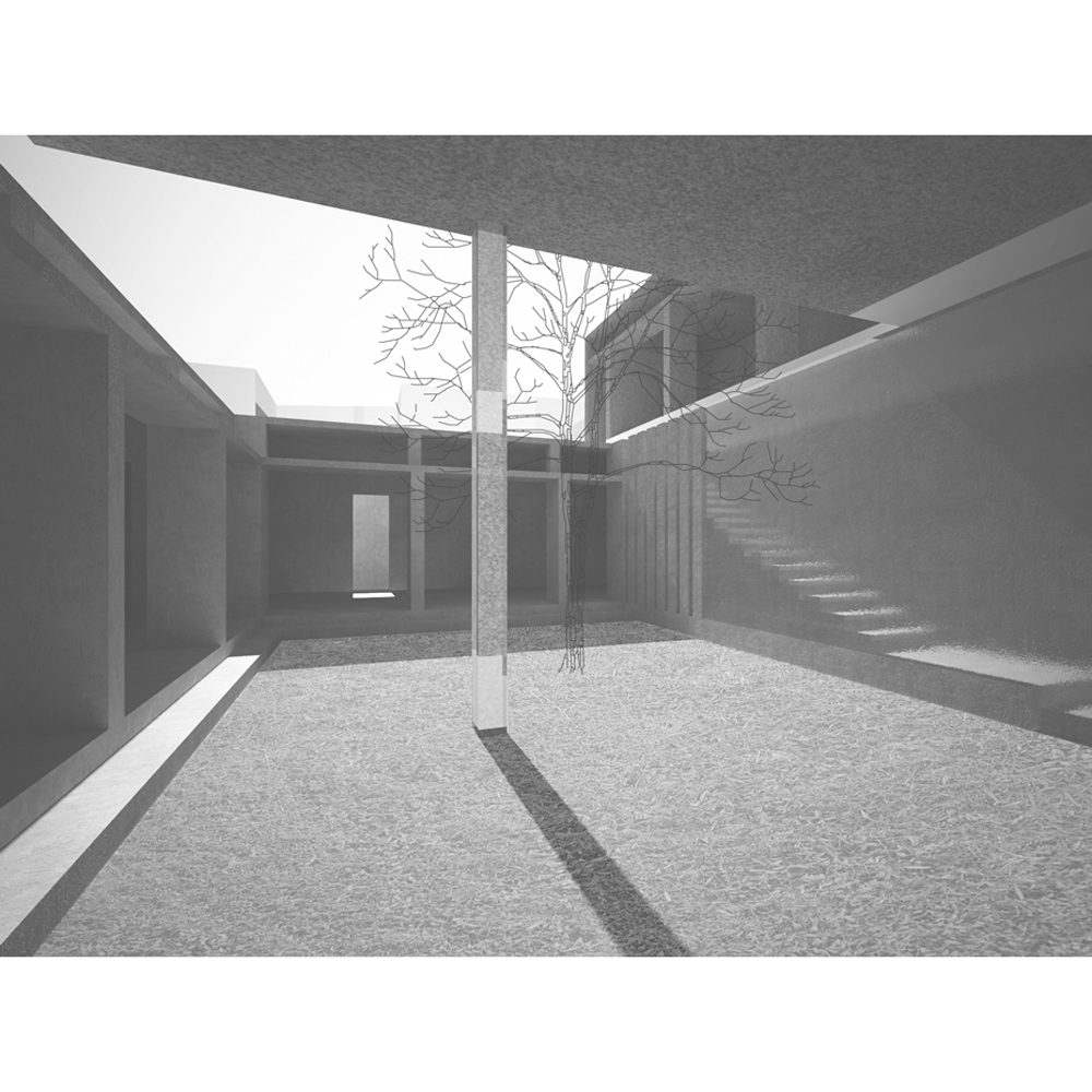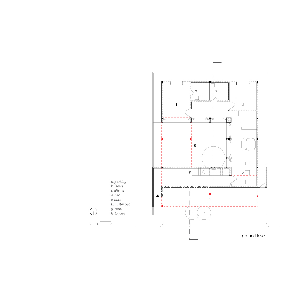 It proposes an alternate mode of dwelling of two separate or extended family units stacked one over the other. The strategy is to blur the line between the street and the L-shaped building configuration that is positioned along the central open space.